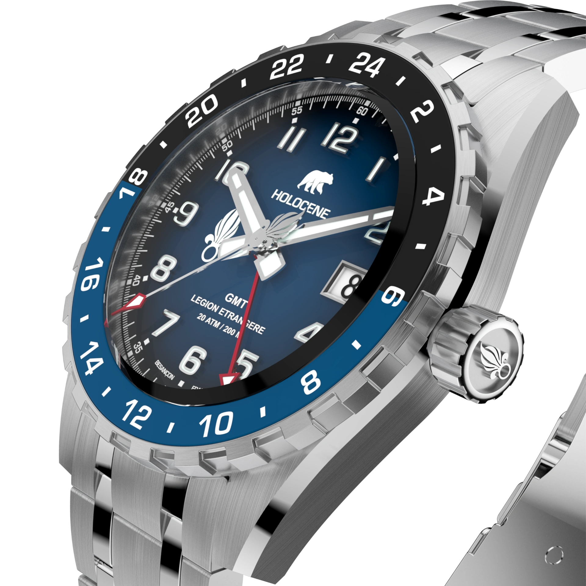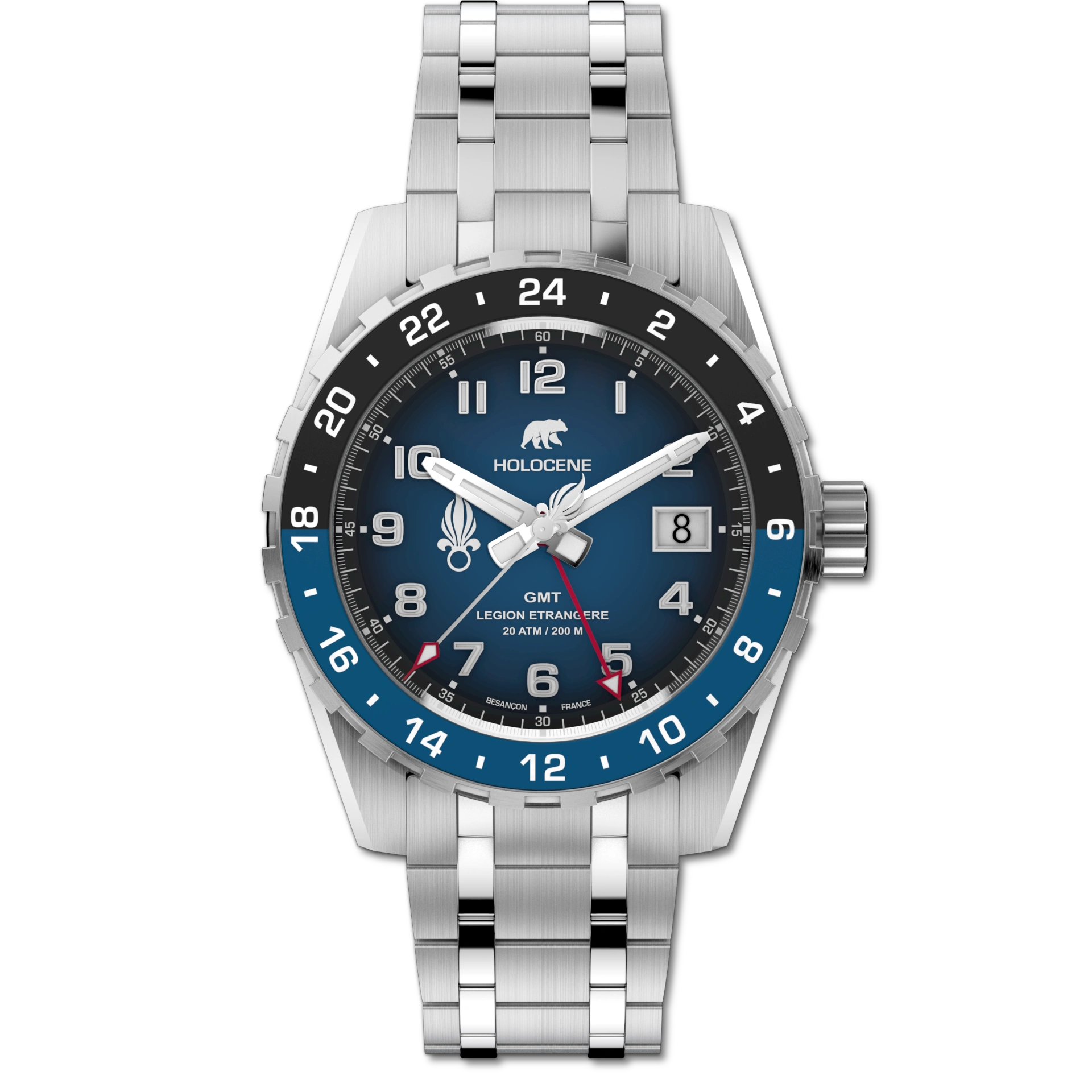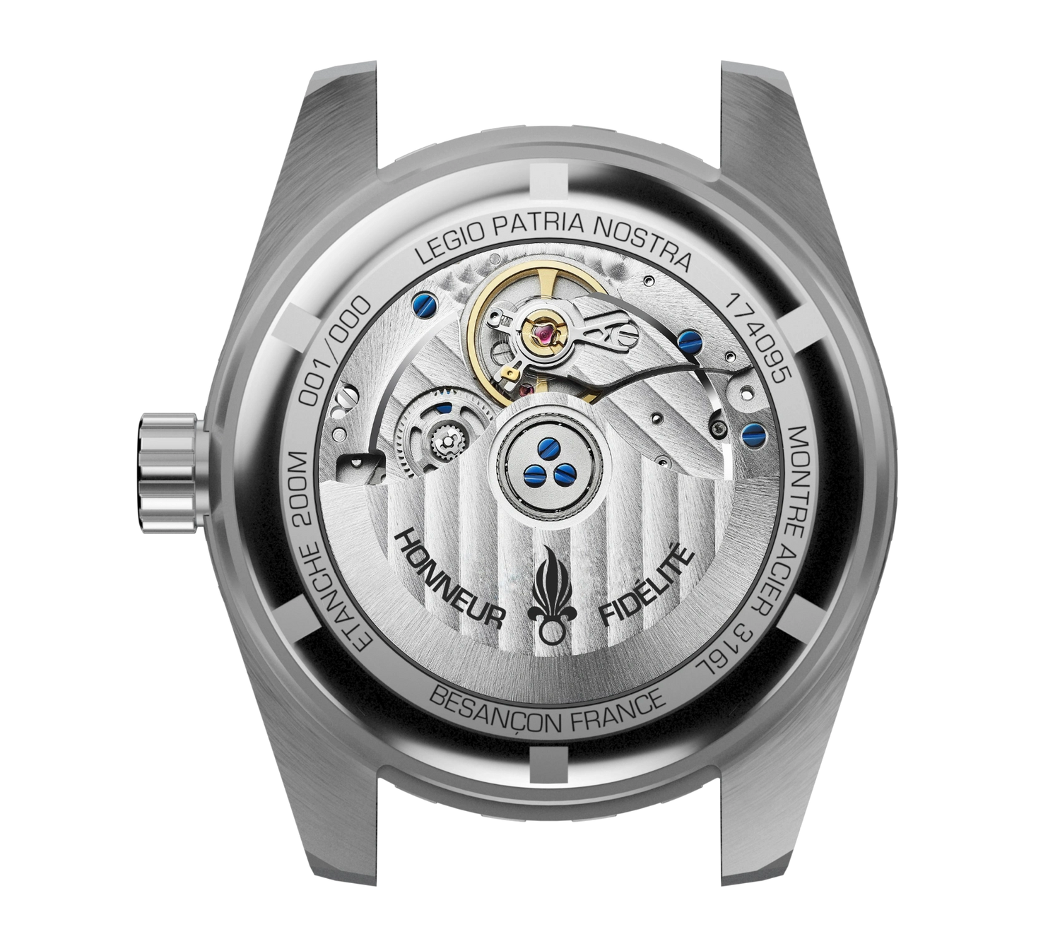 Proposée en série limitée, la MISSION GMT est personnalisée par la gravure : numéro de matricule pour les légionnaires, date symbolique pour les civils.